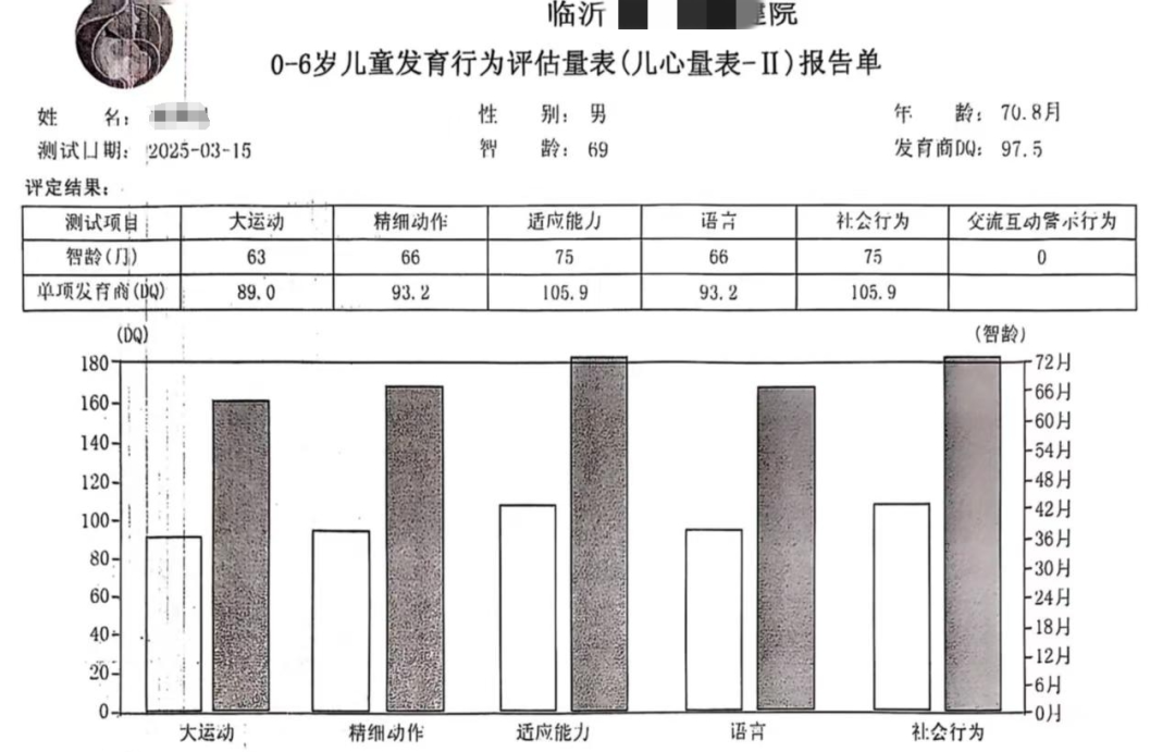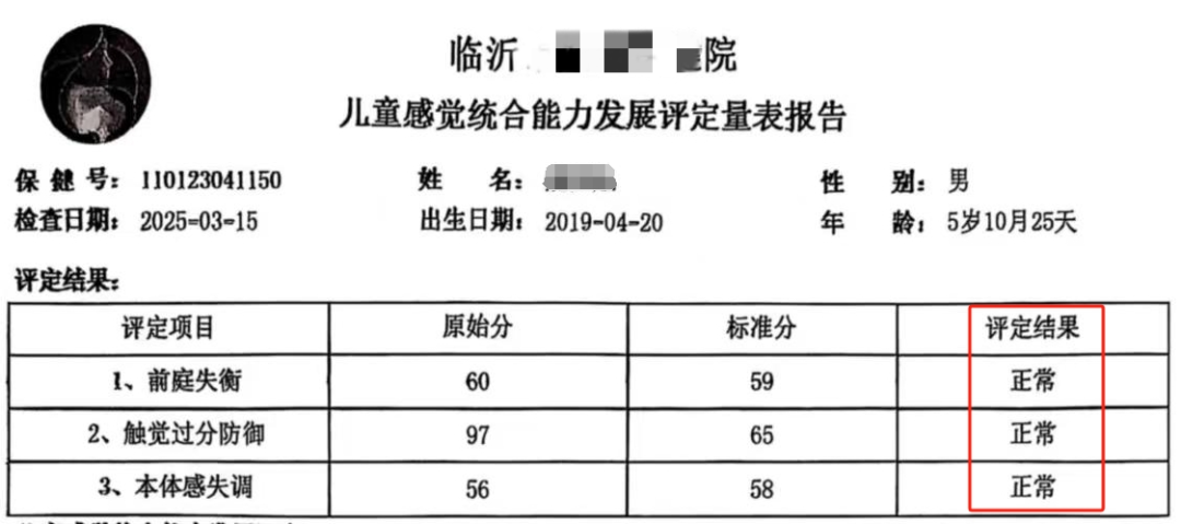 经过数月坚持不懈的努力,奇迹悄然发生。2025年3月15日,小旭父母发来了小旭在临沂市妇幼保健院的多项测评报告。在儿童发育行为评估中,小旭在大运动、精细动作、适应能力、语言、社会行为等方面均有良好表现,发育商为97.5。而在儿童感觉统合能力发展评定中,前庭失衡、触觉过分防御、本体感失调等项目评定结果均为正常,各项指标恢复正常。